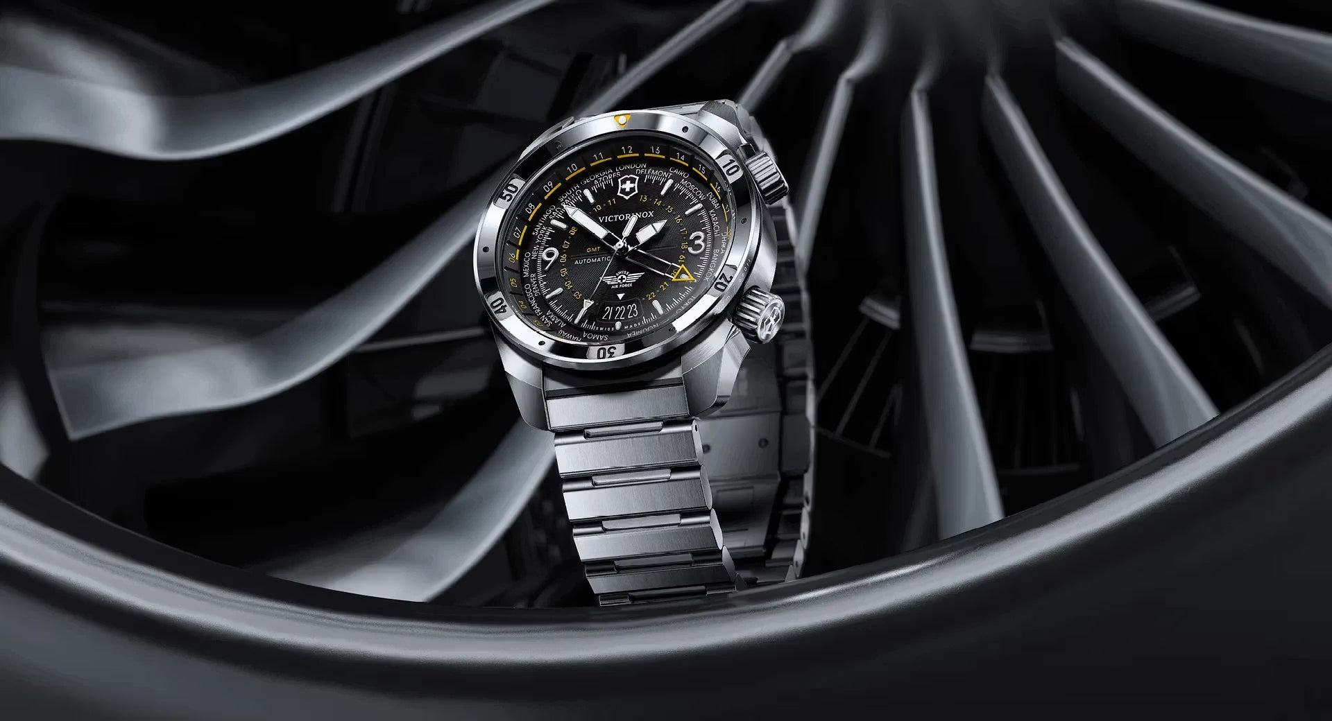 The Air Pro Automatic is a flight-ready timepiece built for precision and endurance. Its three-dimensional dial allows tracking of up to three time zones, with the second time zone indicated via a dedicated GMT hand. Powered by the Swiss Made Sellita SW330-2 automatic movement with a 56-hour power reserve, it features two crowns: a screw-down crown at 4 o’clock for time and a second at 2 o’clock for the GMT functions. It offers ISO shock and water resistance up to 200 m, plus oversized hands and markers filled with Swiss Super-LumiNova®.