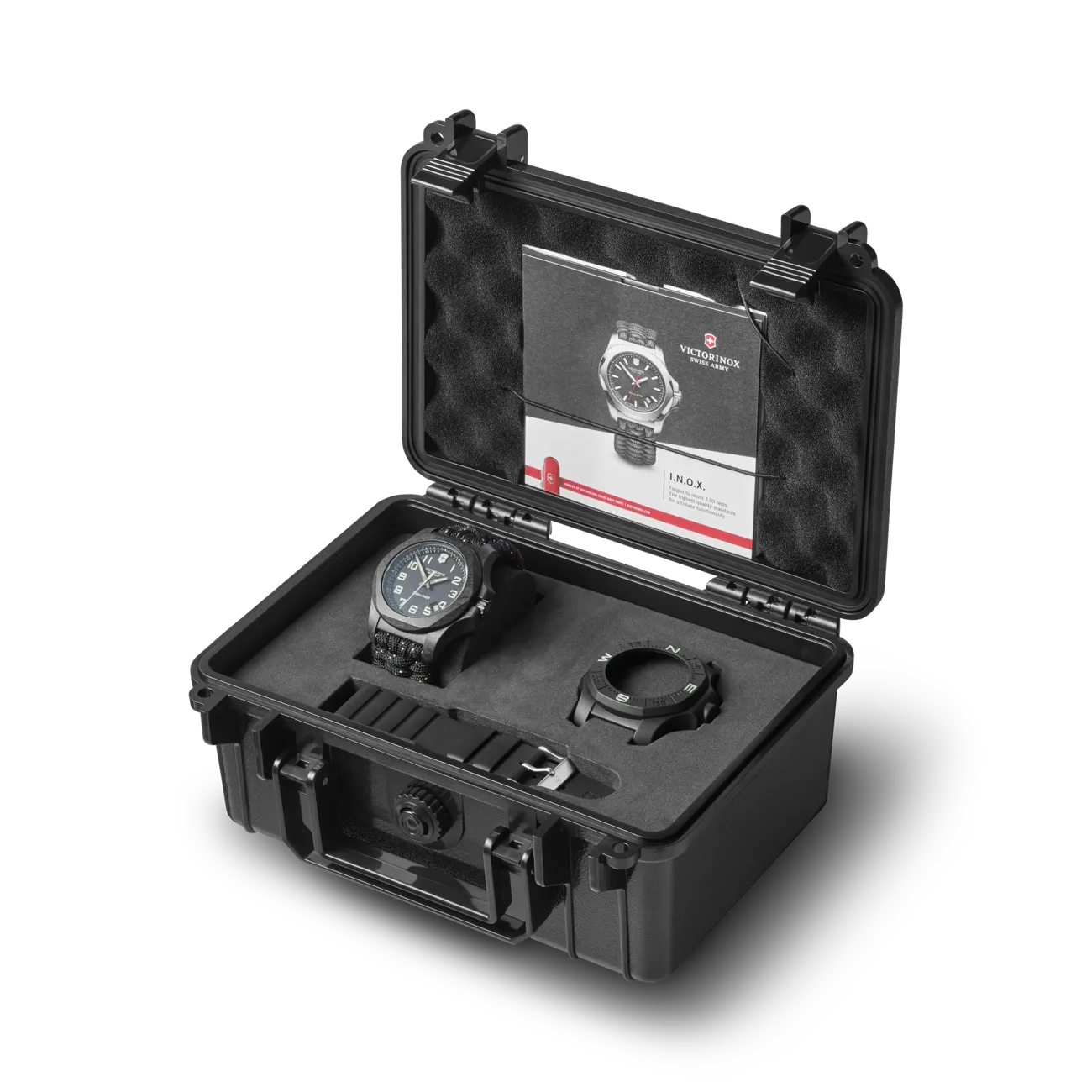 The new, army-inspired I.N.O.X. Carbon is the visionary timepiece that embodies the strength of a warrior with clear-sighted design. It’s all about clarity: the numbers, logo and hands are enhanced with Super-LumiNova® to enable prolonged vision in the dark. Whether you're summiting mountains or riding the daily commute, keep a cool head knowing your I.N.O.X. is crafted with a carbon composite used to protect space shuttles against incredible reentry temperatures. This model pairs a green compass indication with a paracord strap adorned with green tracers to channel the quick-thinking, resilient spirit of the commando. Let the world know you mean business.