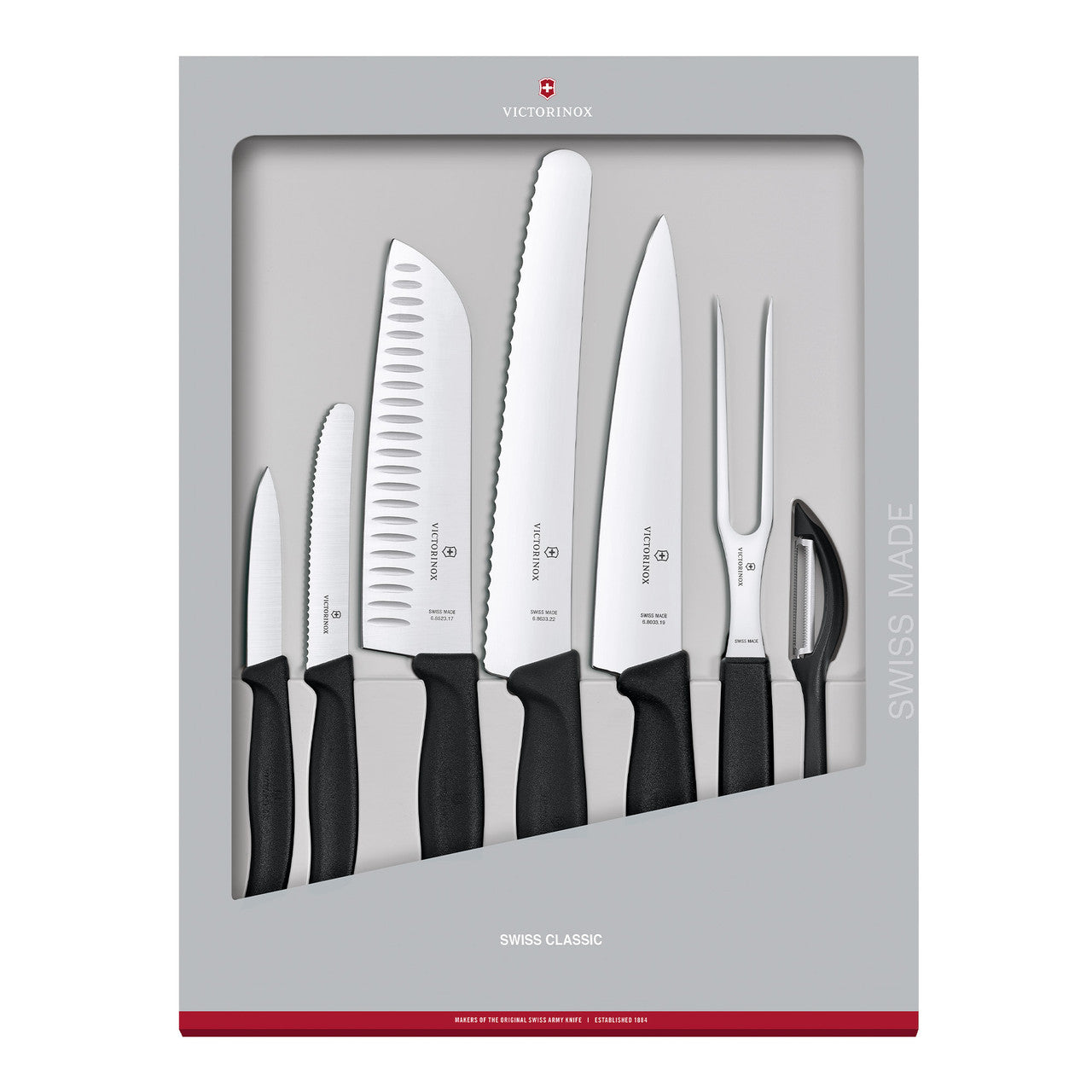 A set of professional knives is the building block of your kitchen. They underpin all your culinary creativity (and dish dreams). You want blades that go the distance and are a pleasure to use. Our Swiss Classic Kitchen Set, 7 pieces, is the natural choice. Containing all the essentials for you to chop, slice, dice, peel and pare your way to professional, restaurant-worthy dining at home.