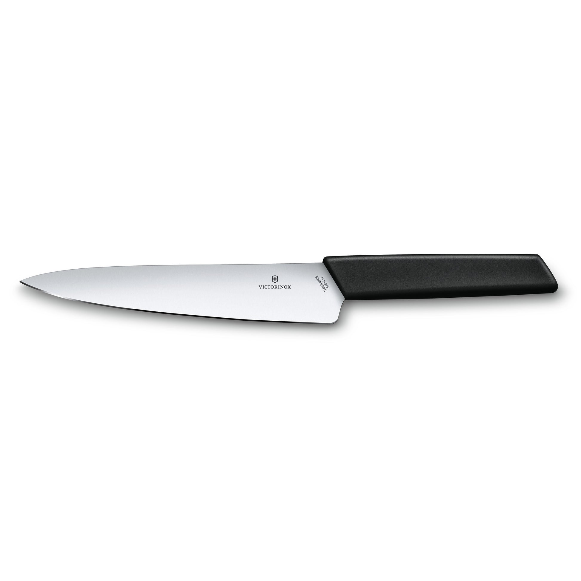 Meet the tool that will carve all your larger joints and meat cuts, no sweat. The super efficient Swiss Modern Carving Knife makes effortless work of dicing a pork shoulder, or slicing through a roast beef or a steak. Just like every piece in the Swiss Modern Collection, it has been ergonomically shaped for ultimate comfort and usability. The stainless steel blade is perfectly counterbalanced by a synthetic handle for slick performance. The subtle, yet standout design pairs well with an array of kitchen aesthetics.
